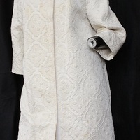 - The white evening coat is made with heavy brocade fabric that has geometric motifs with gold tensile details and three quarter raglan sleeves. The coat includes a shawl collar with hook and eyes in the front closure with a large button hole and a velcro closure from the neckline to the very bottom. The coat include three quarter raglan sleeves and the coat is suitable for sizes large. This kind of silhouette would be worn by the wife of the late President Kennedy, Jacqueline Lee Kennedy Onassis during the 196o's.