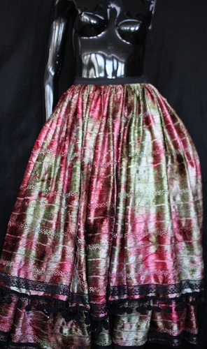 - This skirt is made with multi-color textured velvet fabric that has sequence details. The waist band is made with black cotton and has a small velcro closure. The inside of the skirt is lined with an undergarment skirt that is made with muslin that is gathered create volume in the hem. The skirt velvet has two layers that are both gathered on of which is attached to the velvet skirt. The length of the skirt is 88cm and the waist measures 60cm making it suitable for sizes extra small. The skirt is quite heavy due to the lining that has gathers. The booth of the skirt includes lace and pom-pom details.